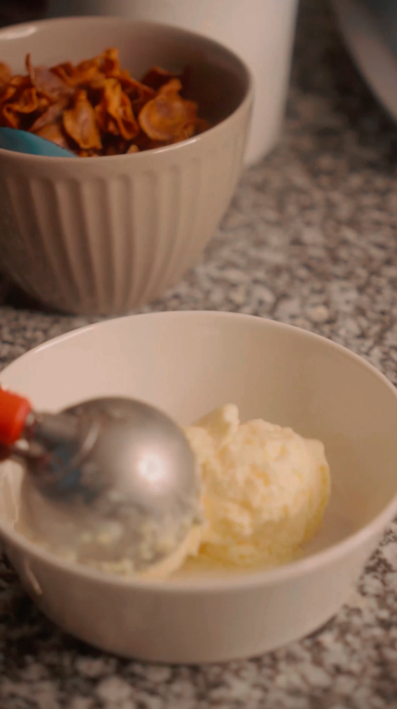 Helado de Vainilla con Crujiente de Zanahoria y Salsa de Cajeta